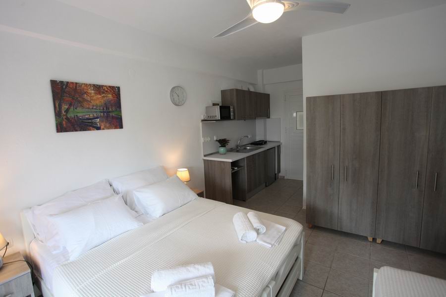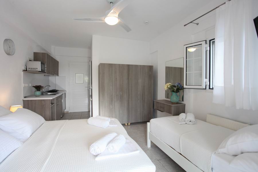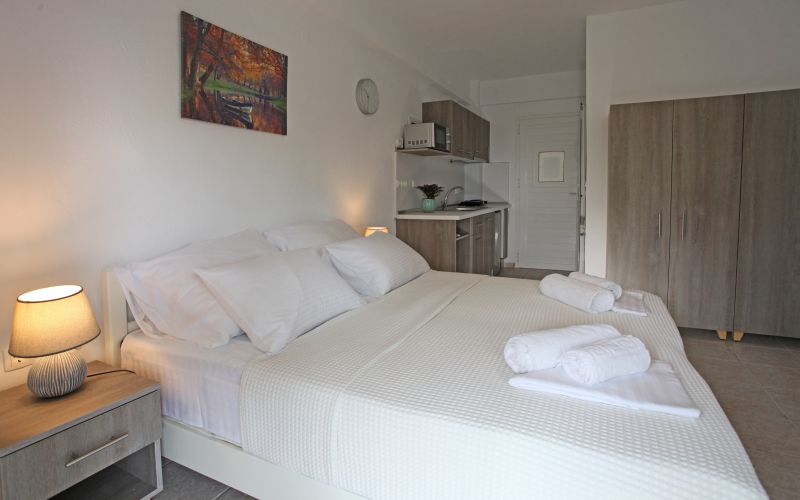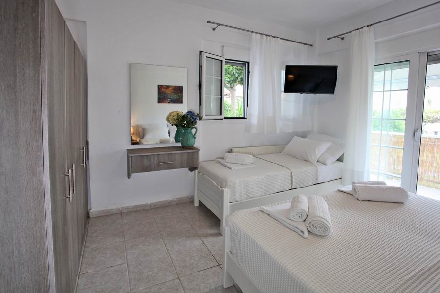 Tři pohodlná lůžka s pěnovými matracemi 80 cm šíře je možno doplnit o přistýlku, plochá TV, trezor, klimatizace s antibakteriální složkou s topným tělesem i pro možné vytápění v chladných měsících, samostatná koupelna s vanou a WC, elektrické zásuvky odpovídající koncovkám českých spotřebičů. Lůžkoviny a ručníky jsou součástí krátkodobého pronájmu.